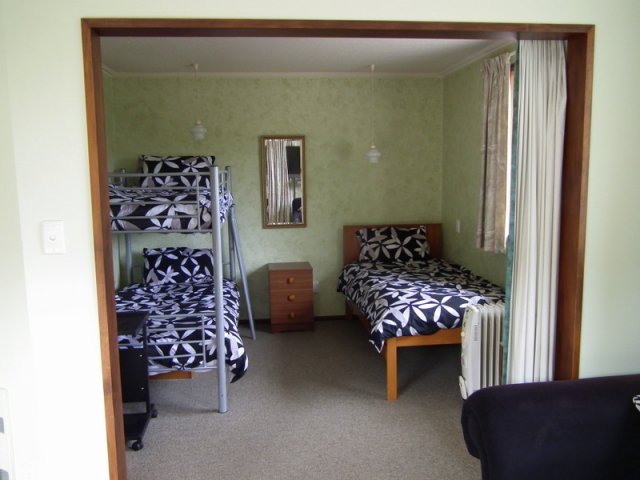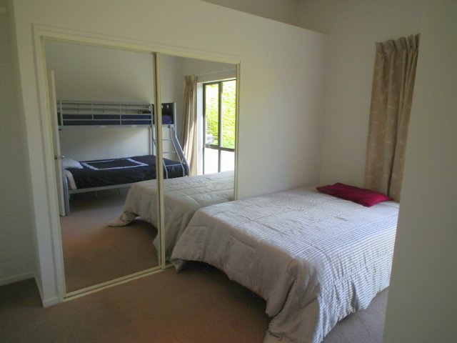 The second door downstairs leads to the third bedroom that consists of a queen bed and a double/single bunk set.