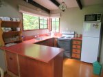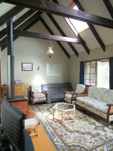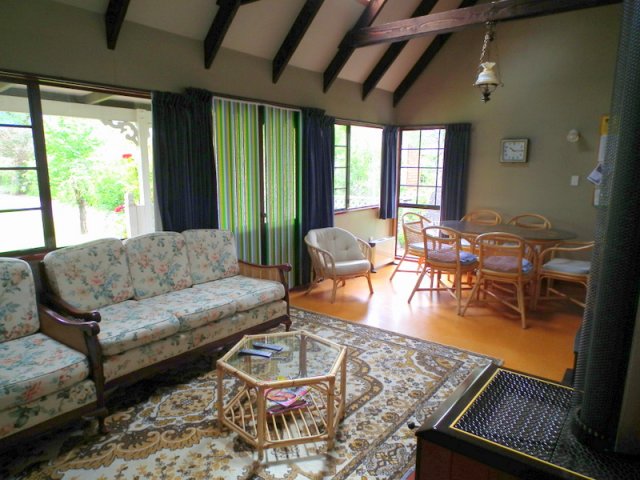 You enter this cute wee cottage through the laundry at the back of the home into an open plan kitchen, dining and lounge area that are heated with a good sized log fire, with fire guard, that heats the whole house in the winter. You can snuggling on the couches watching Sky TV with Sport, or playing one of the numerous board games the home owners have provided for you entertainment. Also provided is a DVD player for those movie nights or just listening to music on the CD player in the lounge.