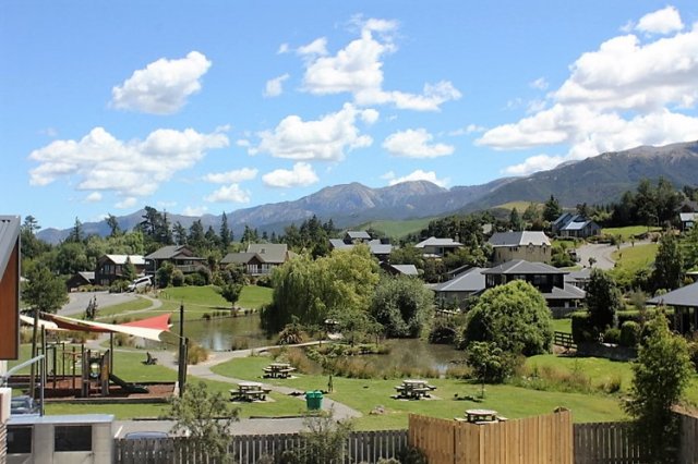 Spacious open plan living areas lead out onto a private patio area that is surrounded by views that look over the duckpond and towards the mountain range.