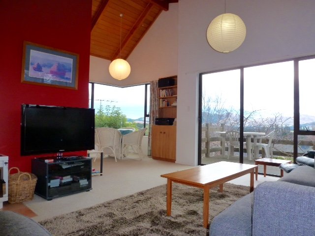 This cozy two bedroom home set on a lovely sunny hill section has stunning views from the deck and main living areas over looking the village and the lovely garden setting. Please note there is a steep access driveway going down from the roadside to a covered carport for your vehicle.