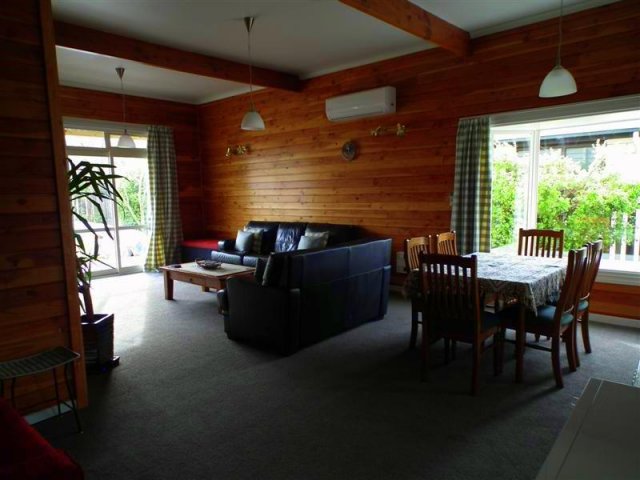 This family friendly house has a fully equipped kitchen and laundry, spacious living area with an I-pod dock for music,Sky TV and a heat pump, three bedrooms (one with ensuite), bathroom and an expansive deck area with BBQ (Gas Bottle hire is not required as the BBQ is connected to the main gas supply). Adjoining is a fully self contained studio unit, with a fridge and microwave plus an ensuite bathroom. There is flat access to the home and the section is fully fenced.