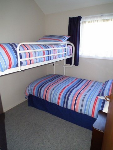 The master bedroom has a lovely sleigh bed with a good quality mattress and electric blanket. The second bedroom has a double single bunk set which will sleep 3, and the third bedroom has the single bed.