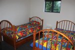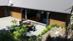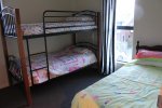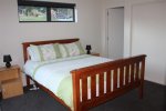 The master bedroom has a queen bed with an en suite and sliders opens out to the courtyard. Bedroom 2 has another queen bed, bedroom 3 has two single beds and bedroom 4 has a single bunk and a single bed.